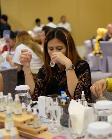 As the session began, participants gathered around rows of carefully arranged fragrance bottles, curious to discover what notes would speak to them most. From elegant florals to refreshing citrus and warm woody accords, each essence told a different story.