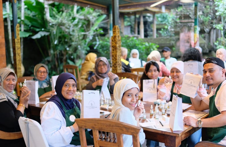 Laughter and curiosity filled the room as the Malaysian guests explored, asked questions, and shared their excitement while crafting their unique perfumes. Each blend became not only a fragrance but also a story of their cultural journey in Bali.
